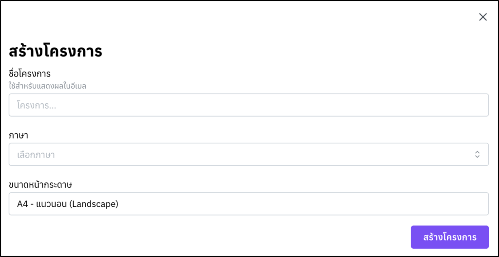 เว็บไซต์จะแสดงหน้าต่างสําหรับระบุข้อมูลในการสร้างโครงการ โดยท่านสามารถระบุ ชื่อโครงการ ใช้สําหรับแสดงผลและส่งภายในอีเมล และภาษาสําหรับภาษาสําหรับส่งอีเมล และแสดงผลวันที่ภายในใบประกาศนียบัตร