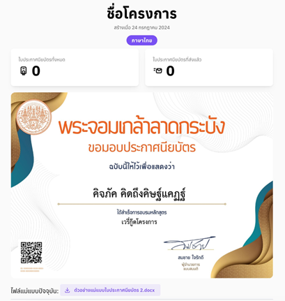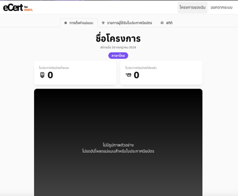 เมื่อสร้างโครงการสําเร็จ ท่านจะสามารถเปิดดูข้อมูลโครงการที่ท่านสร้างขึ้นมาได้ โดยหน้าเว็บจะแสดงชื่อโครงการ จํานวนใบประกาศนียบัตรทั้งหมด และใบประกาศนียบัตรที่ส่งแล้ว