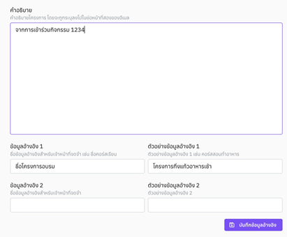 - ข้อมูลโครงการ สําหรับเป็นรายละเอียดโคตรงการเพิ่มเติม โดยจะแสดงผลไปเพิ่มเติมภายในย่อหน้าที่สองของอีเมลที่ส่งมอบใบประกาศนียบัตร