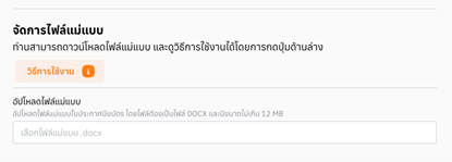 ในช่วงจัดการไฟล์แม่แบบ ท่านสามารถอัปโหลดไฟล์แม่แบบ นามสกุล .docx ได้ รวมถึงสามารถดูวิธีการใช้งานไดโดยการกดปุ่ม “วิธีการใช้งาน”