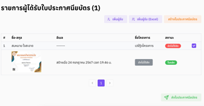 เมื่อเพิ่มผู้รับใบประกาศนียบัตรแล้ว ท่านสามารถกดปุ่ม “สร้างใบประกาศนียบัตร” เพื่อดําเนินการสร้างใบประกาศนียบัตรให้แต่ละผู้รับ โดยระบบจะสร้างใบประกาศนียบัตร ให้กับผู้รับที่เปิดใช้งานอยู่ (เครื่องหมายติ๊กถูกสีม่วง) และเป็นผู้รับที่ยังไม่ได้รับอีเมล (ยังไม่ได้ส่ง)